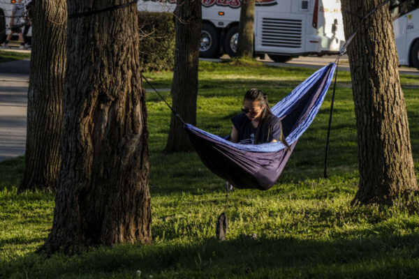 A hammock set up near the Marine Corps War Memorial in Rosslyn (staff photo by Jay Westcott)
