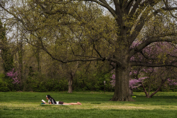 Reading a book near Rosslyn (staff photo by Jay Westcott)