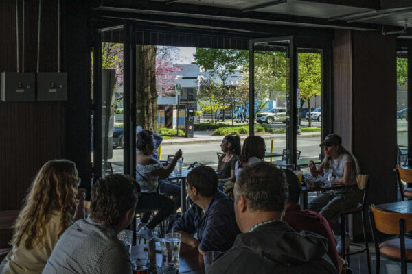 Patrons at Don Tito’s imbibe while watching a bank robbery unfold in Clarendon (staff photo by Jay Westcott)