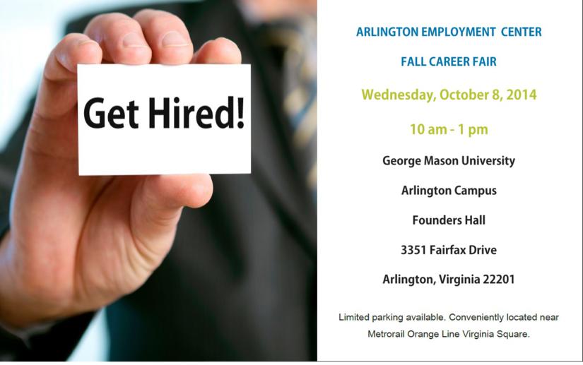 Get Hired! Arlington Employment Center’s Fall Career Fair will be held Wednesday, October 8, 2014 from 10 AM – 1 PM. Located at George Mason University, Founders Hall, 3351 Fairfax Drive, Arlington, Virginia 22201.